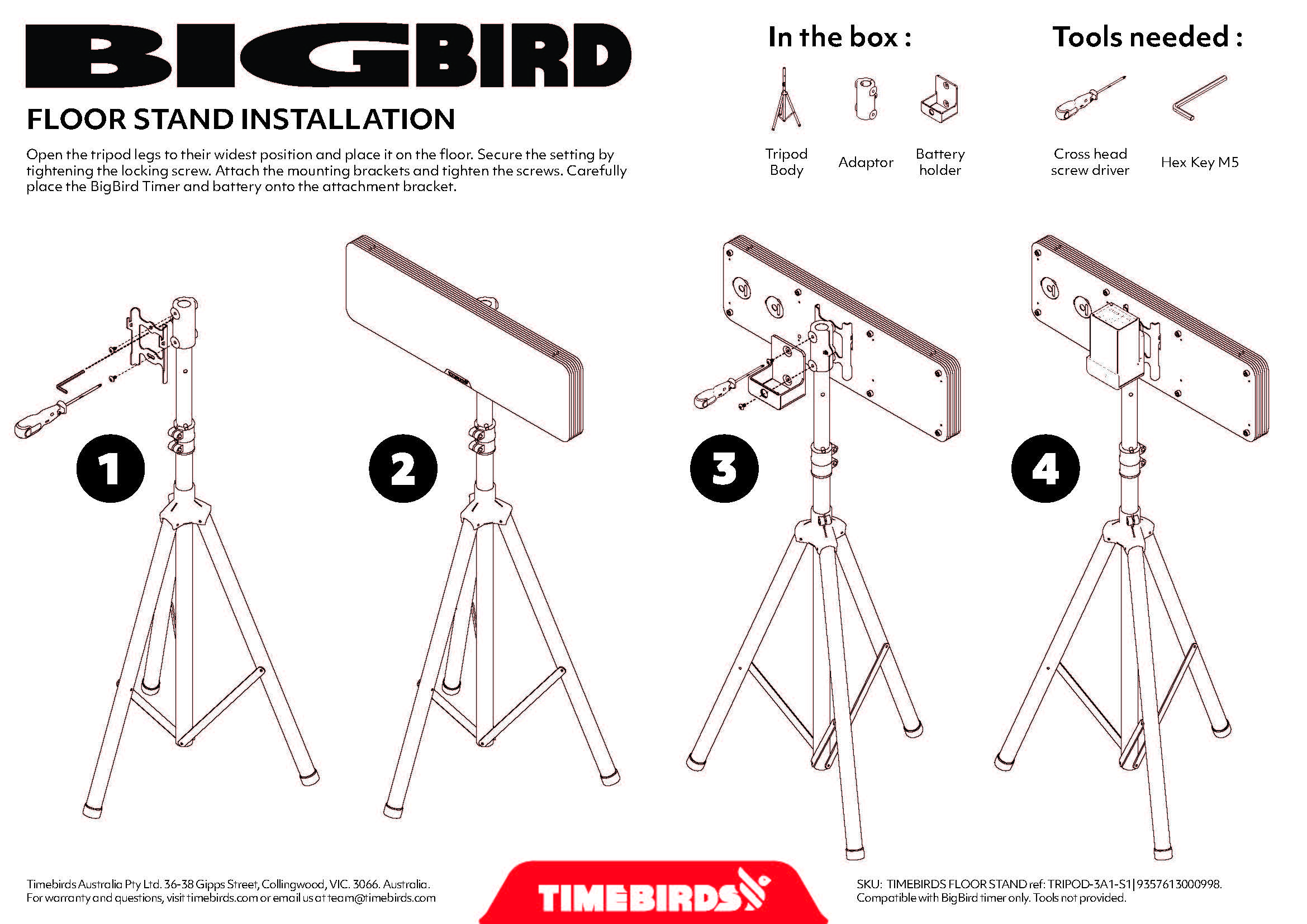 The Timebirds floor stand is a sturdy yet lightweight tripod designed to securely hold one or two BigBird timers, facing in opposite directions. It can be adjusted in height from 1m to 1.8m. The Timebirds floor stand comes equipped with an adaptor onto which you can attach the mounting bracket provided with the BigBird timer.